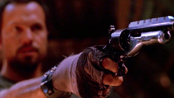 Once again, like many manga/anime creators, GITS creator Masamune Shirow, is inspirited by BLADE RUNNER, and it could be that Section-9 newbie Togusa (used to be a normal cop) choice in handguns is a visual reference to Deckard's Detective Special. The Mateba of Togusa is featured in the original manga, the 1995 OVA, and the rest of the GITS works. Unlike many of the fictional sci-fi revolvers on this list, Togusa's revolver is an real-steel gun. The Mateba Auto-Revolver first came out in 1997 and lasted through 2005. The real gun bears a striking similarity to Deckard's blaster, and one variant of the Mateba fires a round that would be at home in the 2019 blaster, the .454 Casull. I would love to add an Mateba to my firearms collection!The Slammer Mega-Revolver from Hard Boiled